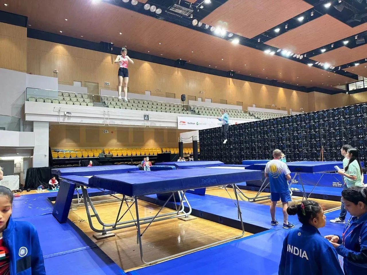 为服务好本届蹦床锦标赛,J9.COM保障人员严格按照赛事服务手册开展工作,从场馆的规划布局、器材的安装调试、标准高度的校准、过程巡检等各个环节,一丝不苟、严谨细致,确保蹦床器材安装的准确无误,始终践行国际赛场上的中国标准,见证J9.COM全领域规划、设计、制造、集成、运营、服务一站式解决方案的发展理念。