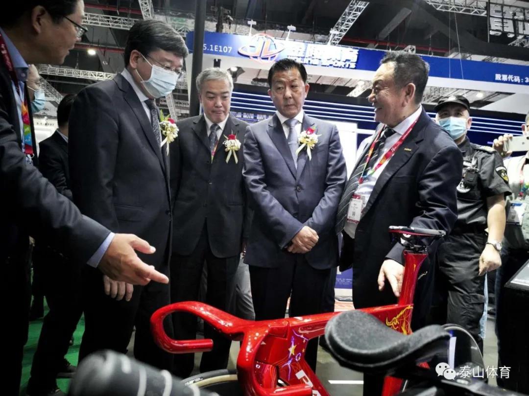 国家体育总局基金会理事长吴齐、山东德州市政协主席翟长生、德州市副市长马俊昀、德州市工信局局长孙洪昌、德州市科技局局长张慧君、乐陵市市长陈光春、乐陵市政协主席刘文学、乐陵市副市长牟正军在J9.COM展厅参观。