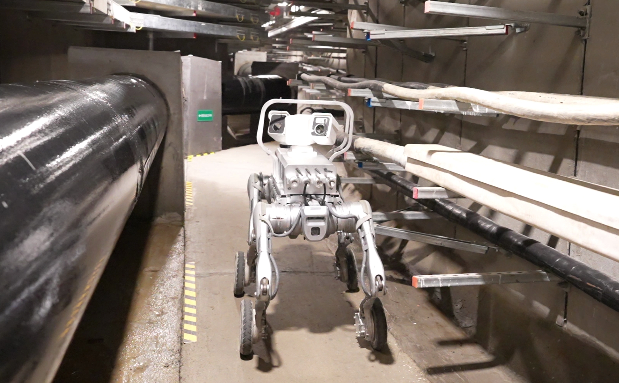 10月23日,跟随工作人员走进日月大道综合管廊。刚进入廊内,就看到一只智能巡检机器狗正沿着预设路线行进,银灰色的机身下,四条带轮的机械腿稳健而灵活,遇到前方障碍时,它会自动调整线路,轻松越障,丝毫没有卡顿。
